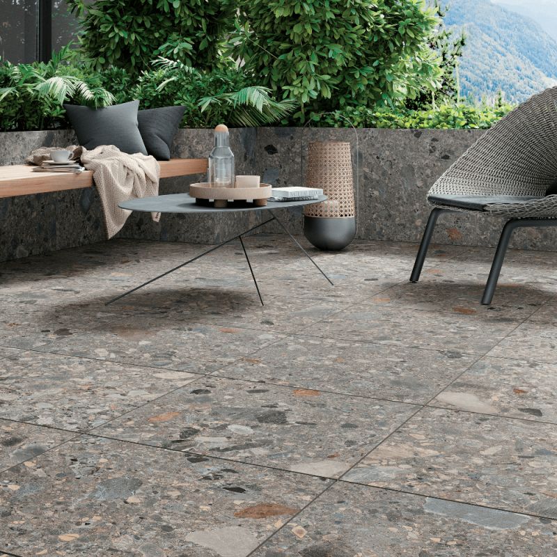 Le carrelage d'extérieur en grès cérame GRUS de la gamme NORR par Mirage est conçu pour les terrasses modernes. Adapté à la pose sur plots, ce matériau offre un grain harmonieux irrégulier, des galets multicolores de différentes tailles et des effets tridimensionnels. Les nuances vont du ton sur ton aux teintes plus intenses comme le marron, le bleu et l’anthracite. GRUS est idéal pour les projets qui réinterprètent la nature avec une touche créative et contemporaine.