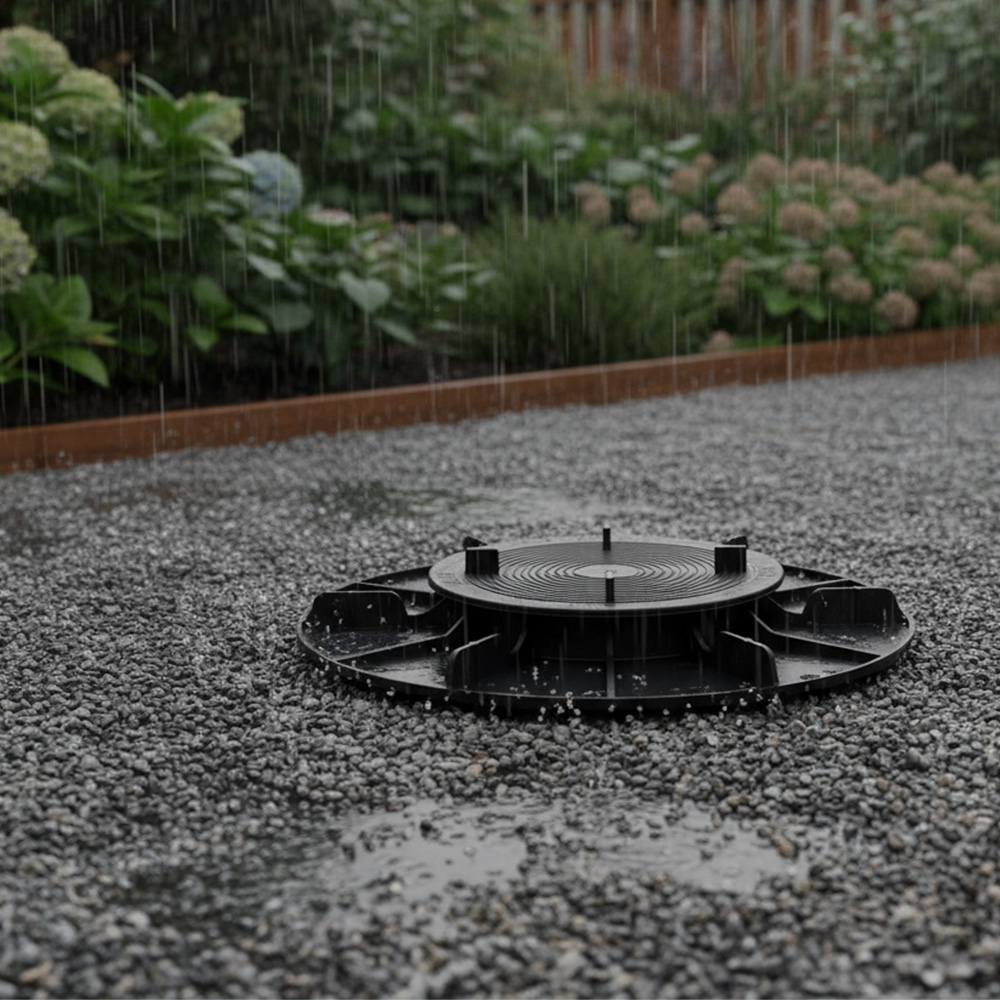 Quant à eux, les 4 ergots situés sur la tête des plots calent et stabilisent les dalles sans aucune fixation. Pratique, ils jouent le rôle d'écarteur de dalles et vous permettent ainsi de réaliser une pose uniforme des dalles sans prise de tête. Les ergots espacent de 3 mm les dalles et les joints sont laissés ouverts pour faciliter l'écoulement de l'eau.