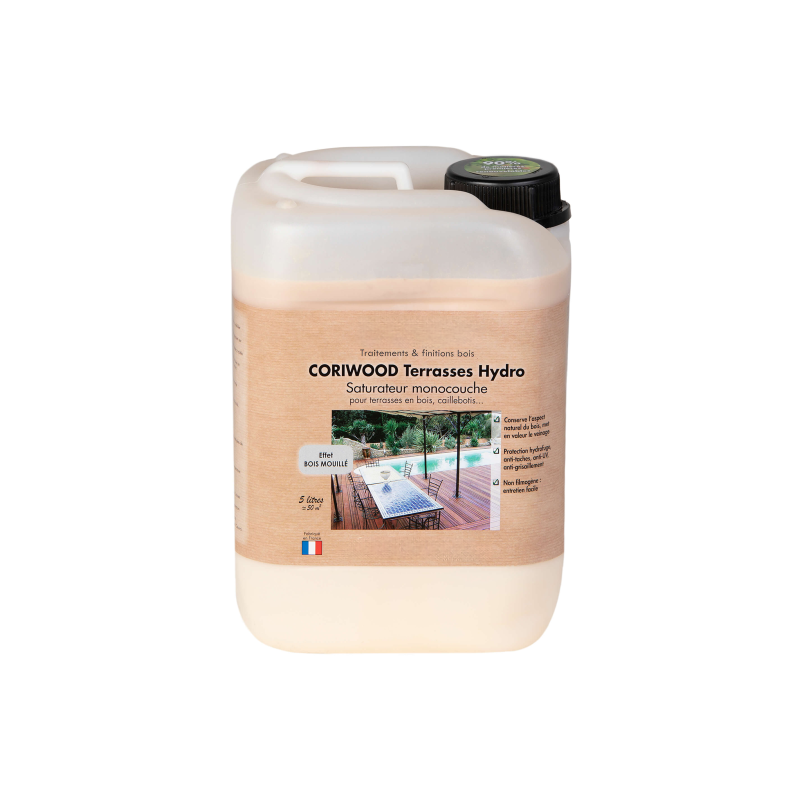 Saturateur Hydrofuge teinté. Ce saturateur teinté existe en deux coloris au choix : Chêne moyen et Ipé. Avec son application monocouche il permet de saturer de grandes surfaces de bois une à deux fois par an. Existe en seau métallique d'1 L et en jerrican de 5 L.