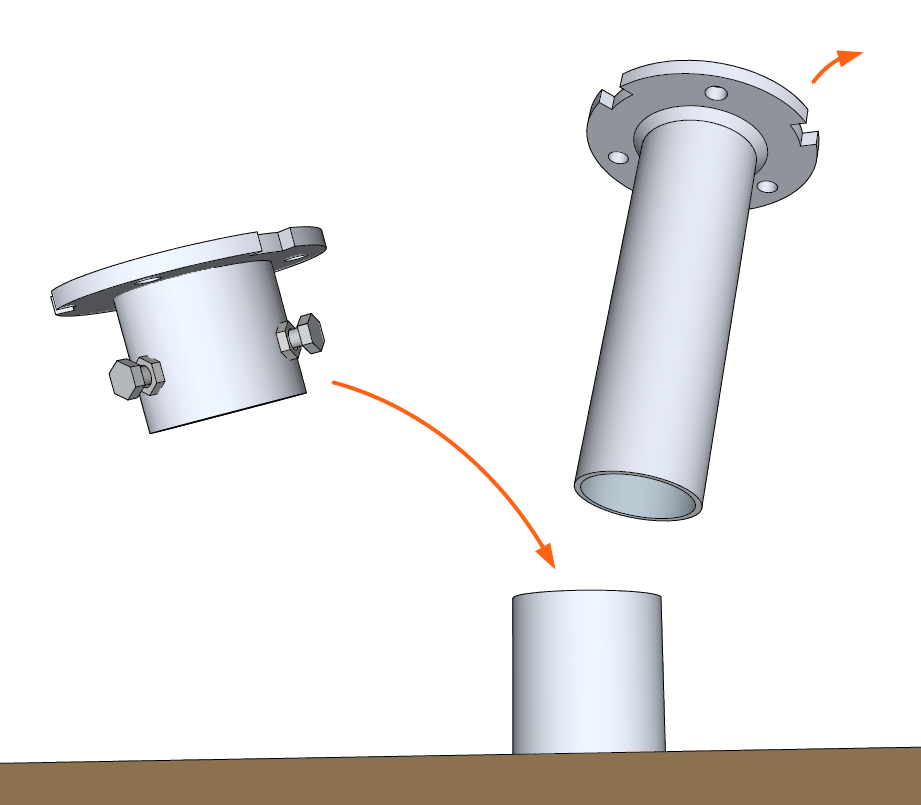 Connecteur « chapeau » qui se fixe avec trois vis M12 sur une vis de fondation bloquée, dont on a coupé la tête. Ce connecteur est également utilisé pour placer des connecteurs sur un tube 60 ayant servi de rehausse sur une vis de fondation.